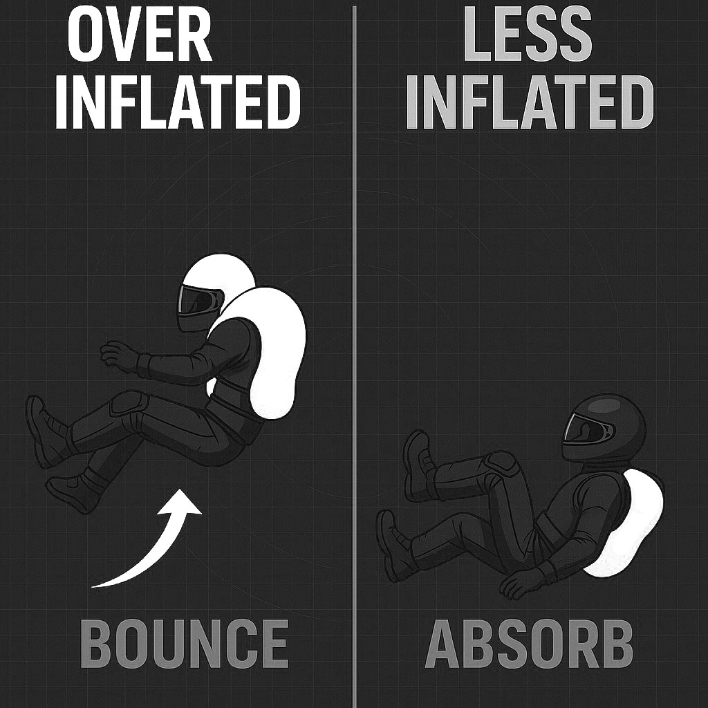 Un airbag moto fonctionne en se gonflant très rapidement pour amortir le choc. Problème : s’il se gonfle trop fort, il devient trop rigide. Résultat ? Il n’absorbe plus suffisamment l’énergie de la chute et la renvoie partiellement vers le corps du pilote.